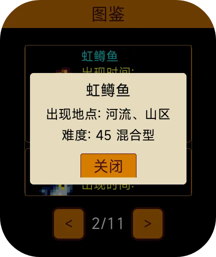 沉浸式体验:多地图 + 时间流逝,体感,全屏点击操作;多达60种可钓鱼类。