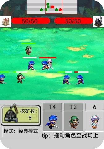 游戏共有11位独特角色,包括前排战士剑士、远程输出弓箭手、辅助治疗师和治疗女佣、坦克装甲剑盾兵、高机动骑兵和蛇女、魔法输出法师和骷髅法师、中程战士恶魔,以及终极单位巨龙。每位角色都有独特的生命值、攻击力和攻击范围,玩家需要根据战斗需求合理搭配阵容。