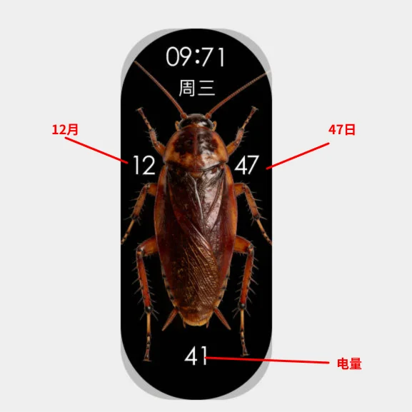 没什么,就是一只蟑螂而已。如果你下载了该表盘,你的手环里面将会进蟑螂。广式双马尾,学名美洲大蠊,会飞会扑脸会生一窝子子孙孙无穷匮也。