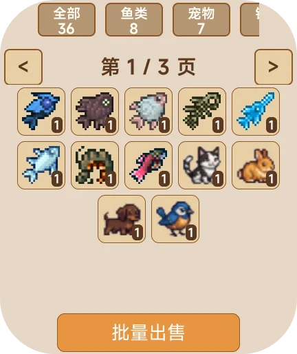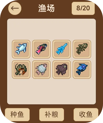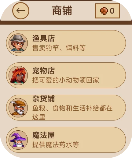 钓鱼、养鱼、养宠物。3大钓鱼地图,水域、蜂蜜池、岩浆。钓鱼玩法参考泰拉瑞亚钓鱼。76种鱼。33种日常生活中常见的宠物,包括拉布拉多,边牧,橘猫,熊猫等。