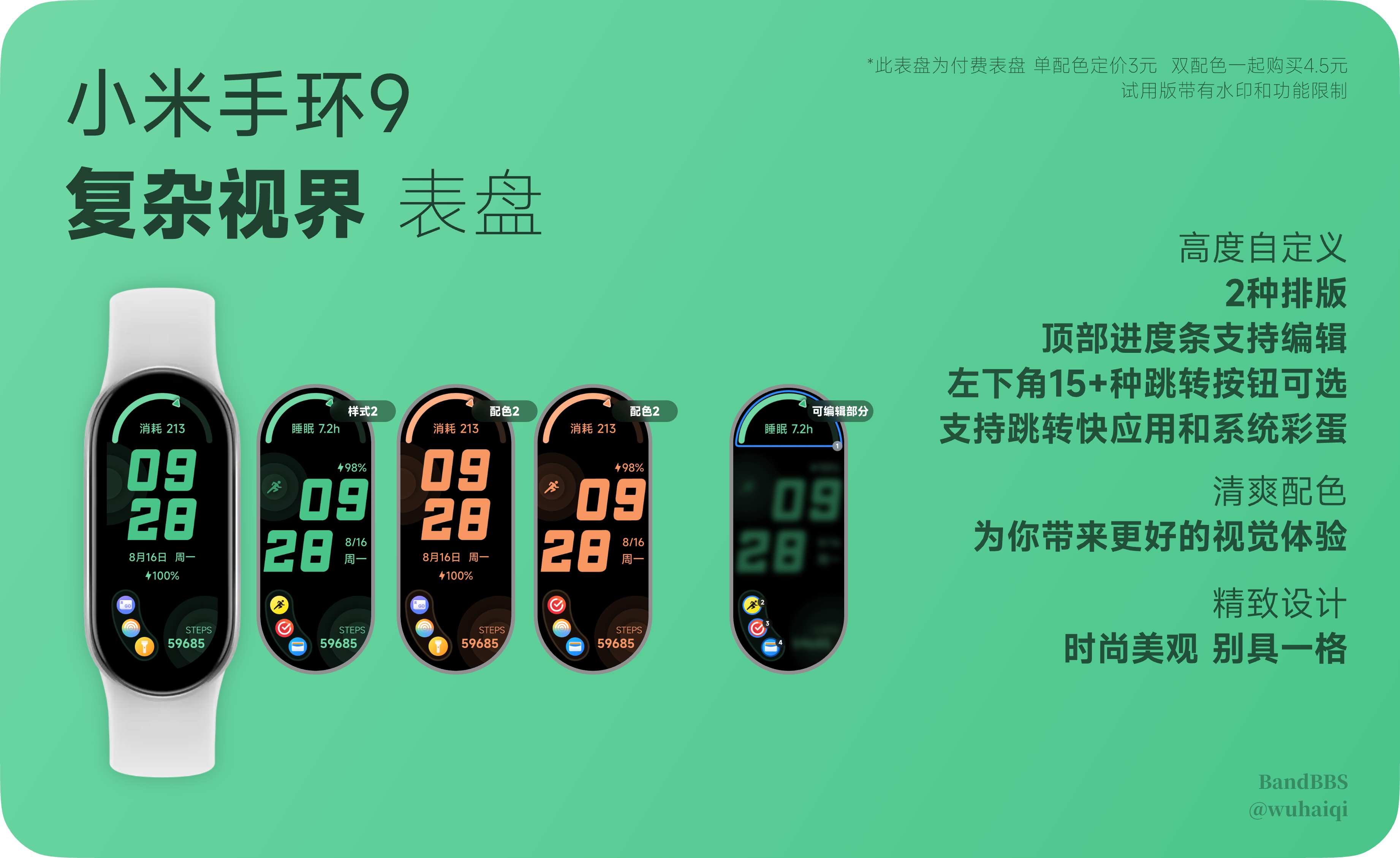 wuhaiqi 提交新资源: 【多样式表盘】复杂视界 (付费 · 可免费试用) - 小米手环9 复杂视界 表盘 小米手环9 复杂视界 表盘 单配色定价3元,双配色一起买只需4.5元 (试用请到标题下方按钮下载,只有绿色) (付费表盘所有配色功能无差别) 浏览附件29517 该表盘为付费表盘,此贴仅提供购买方式和试用。 一次购买,多次更新... 点击展开... 阅读关于此资源更多信息...