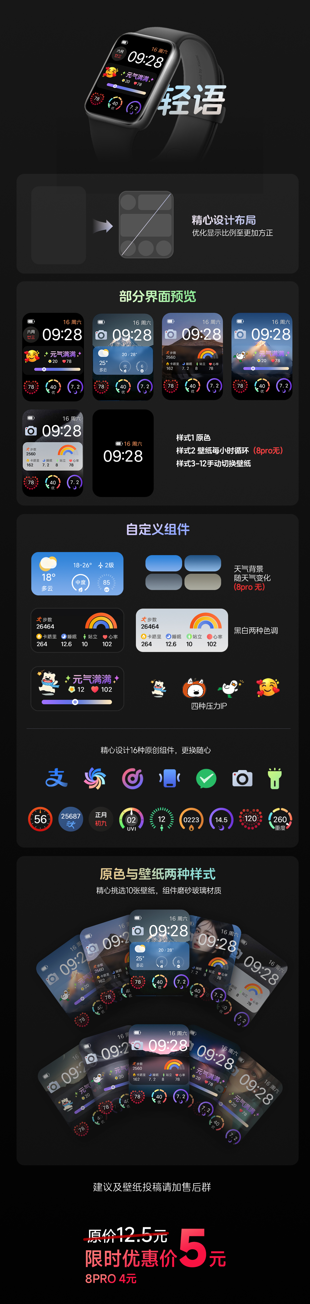 Mzl26_ 提交新资源: 轻语 - 多功能极简表盘 8pro和9pro都可以从此链接购买 2025.4.27 1.8版 新增卡包、运动跳转组件 2025.4.23 1.7版 新增左上角电池自定义关闭 新增电量圆形小组件 2025.4.21 1.4版 新增天气小组件 新增右上角日期跳转日历 修复运动组件站立数据位置错误 修复睡眠+卡路里进度条细节优化 浏览附件40478 点击展开... 阅读关于此资源更多信息...