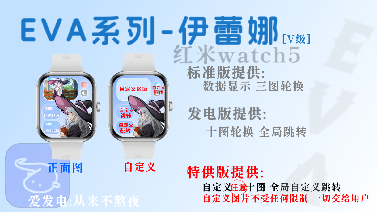 [红米watch5]伊蕾娜自定义轮换[10张]图 4-5MB左右全网首款!最宠粉的表盘制作者 - 自定义[10张]图片 不受限制 交给用户 自定义组件跳转 共5处 状态栏实时显示蓝牙勿扰