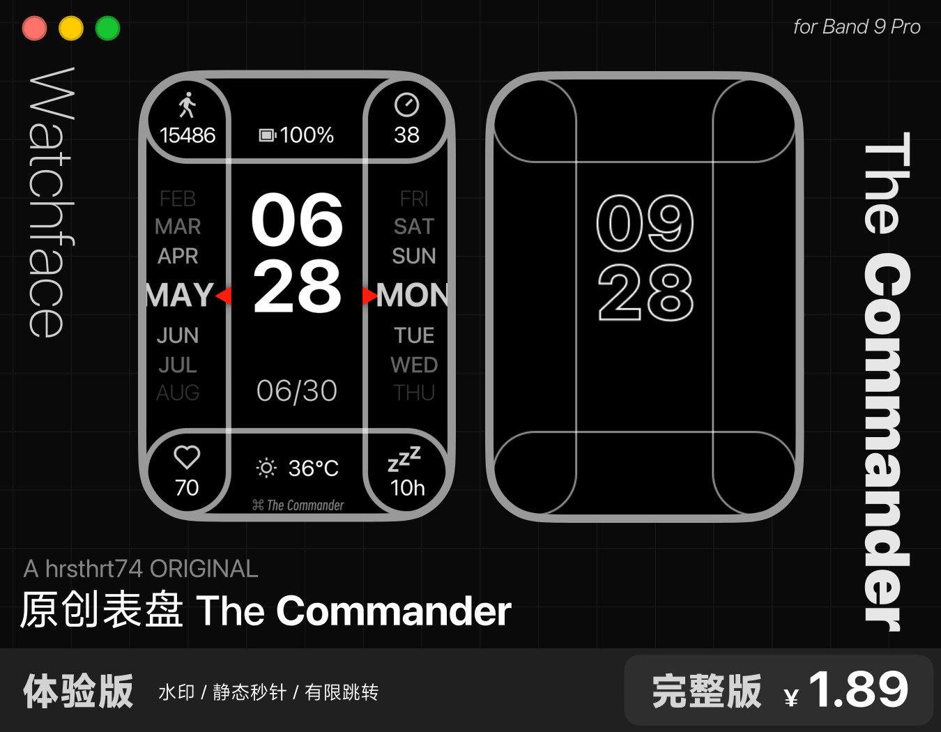 hrsthrt74 Lv.0 社区会员 米坛社区六周年纪念勋章 2025-07-06 #1 hrsthrt74 提交新资源: [体验版] The Commander - 掌控全局 浏览附件44805 掌控全局。 hrsthrt74 的首个原创表盘——The Commander,为小米手环 9 Pro 打造。以 macOS 的 ⌘ 为灵感设计,⌘ 延伸至边框,与屏幕完美贴合 【完整版 传送门,售价 1.89 元】 ⭐特点 特色时光滚轮设计:贴合边框,静观时光在腕间流过。 经典黑白配色:简单克制又不失可读性,重要信息一目了然 小身材,大用途:体积仅 199kb,多种数据显示。 丰富的快速跳转:活力指标、闹钟、心率、睡眠、日历、天气,触手可及。(体验版仅天气、日历可跳转) ⌘ in AOD:熄屏时也有 ⌘ ,呼应主题 ... 点击展开... 阅读关于此资源更多信息...