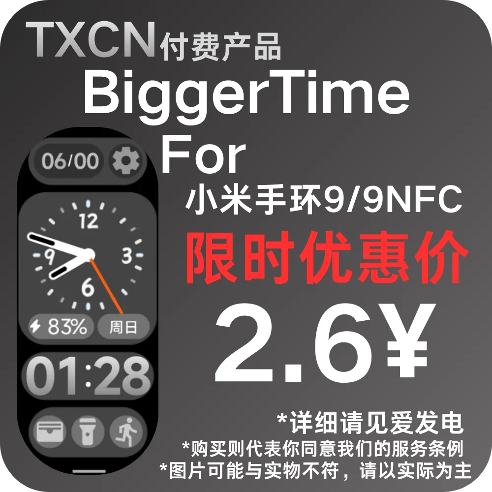 TXCN wst..x.. 👑大会员 社区会员 2025-11-21 #1 TXCN 提交新资源: TXCN BiggerTime(band9) - 大时间,多功能快应用跳转,aod高级熄屏......等你去探索 TXCN原创设计 浏览附件54306 1.大指针 2.大数字 3.Aod简洁熄屏 4.五个跳转组件 5.多功能显示 该表盘为付费表盘,需(限时优惠)2.6元RMB解锁。请进入爱发电购买。 点击展开... 阅读关于此资源更多信息...