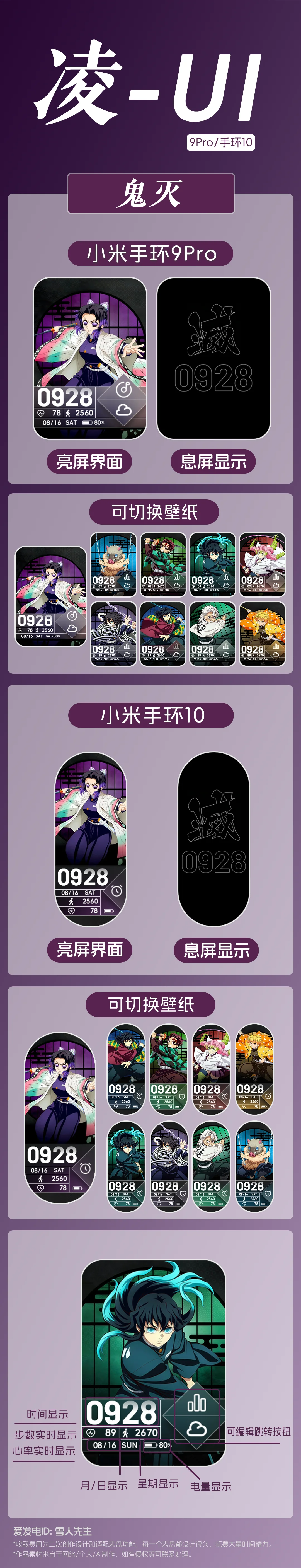 雪人先生 Lv.0 社区会员 2025-12-28 #1 雪人先生 提交新资源: 凌UI-鬼灭,手环10表盘上新!!! - 表盘上新!!!,/内置9张壁纸随心切换/步数/心率数据实时显示/可编辑跳转小组件/息屏显示。 表盘上新!!!,/内置9张壁纸随心切换/步数/心率数据实时显示/可编辑跳转小组件/专属息屏。 该表盘支持的型号:小米手环10,小米手环9Pro。 如果您想购买此表盘可通过顶部右侧[第三方购买]按钮,前往爱发电下单! 浏览附件56431 点击展开... 阅读关于此资源更多信息...