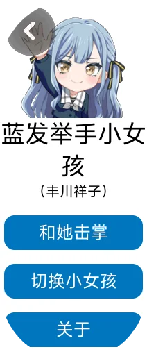 Dreamqiu 梦见未来 🔥创作者 社区会员 2026-01-18 #1 Dreamqiu 提交新资源: 蓝发举手小女孩 - 一个和Mygo和Ave mujica里的人物击掌的小游戏 免费的小游戏 因为我感觉我最近看Mygo和Ave mujica看魔怔了,并且“蓝发举手小女孩”这个梗也挺好玩的,所以就把哔哩哔哩上的Mygo和Ave mujica里的人物表情包都做成了这样的一个小游戏玩法:点击屏幕上的人物图片与她们击掌,击掌次数会被记录下来。 另一个功能:切换点击的人物的图片 欢迎大家看看《迷途之子》(Mygo)和《颂乐人偶》(Ave mujica)!(虽然ave mujica很神人) 浏览附件57592浏览附件57593浏览附件57594浏览附件57595浏览附件57596[ATTACH type="full"... 点击展开... 阅读关于此资源更多信息...
