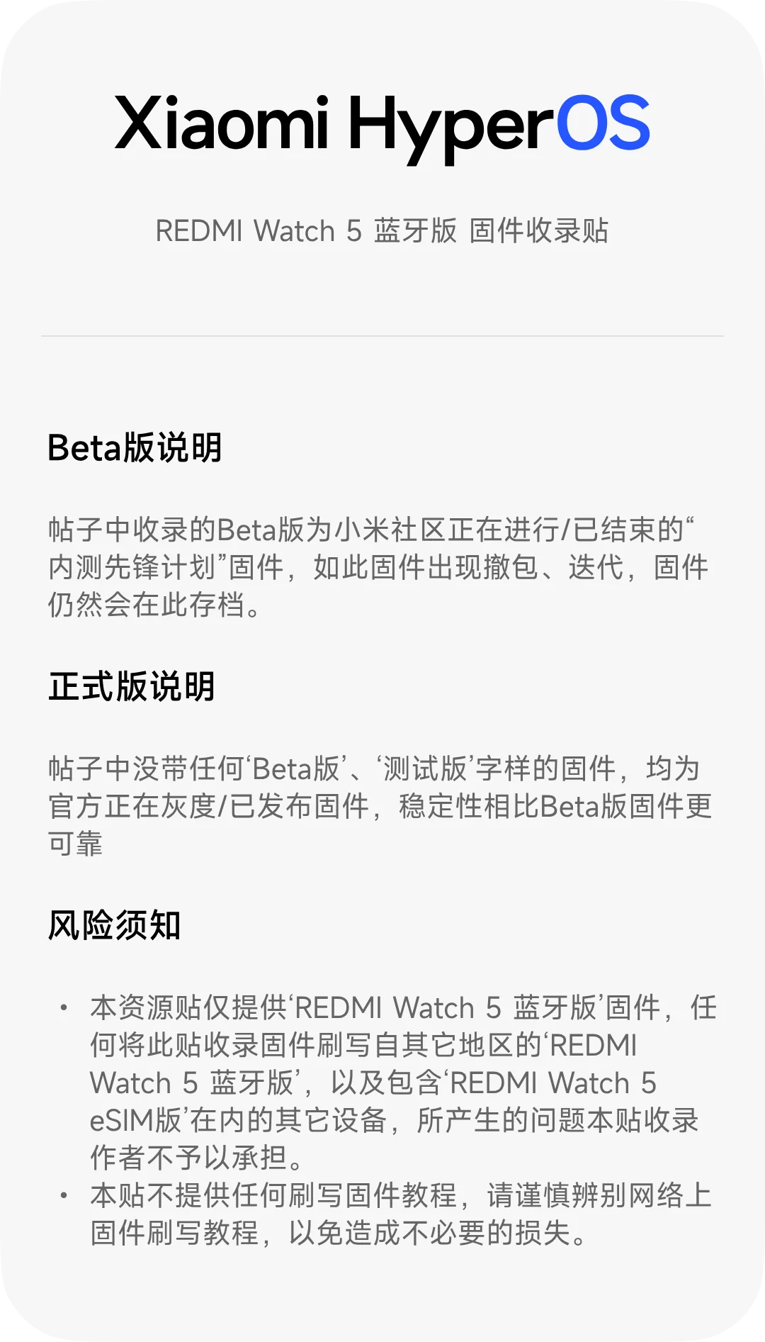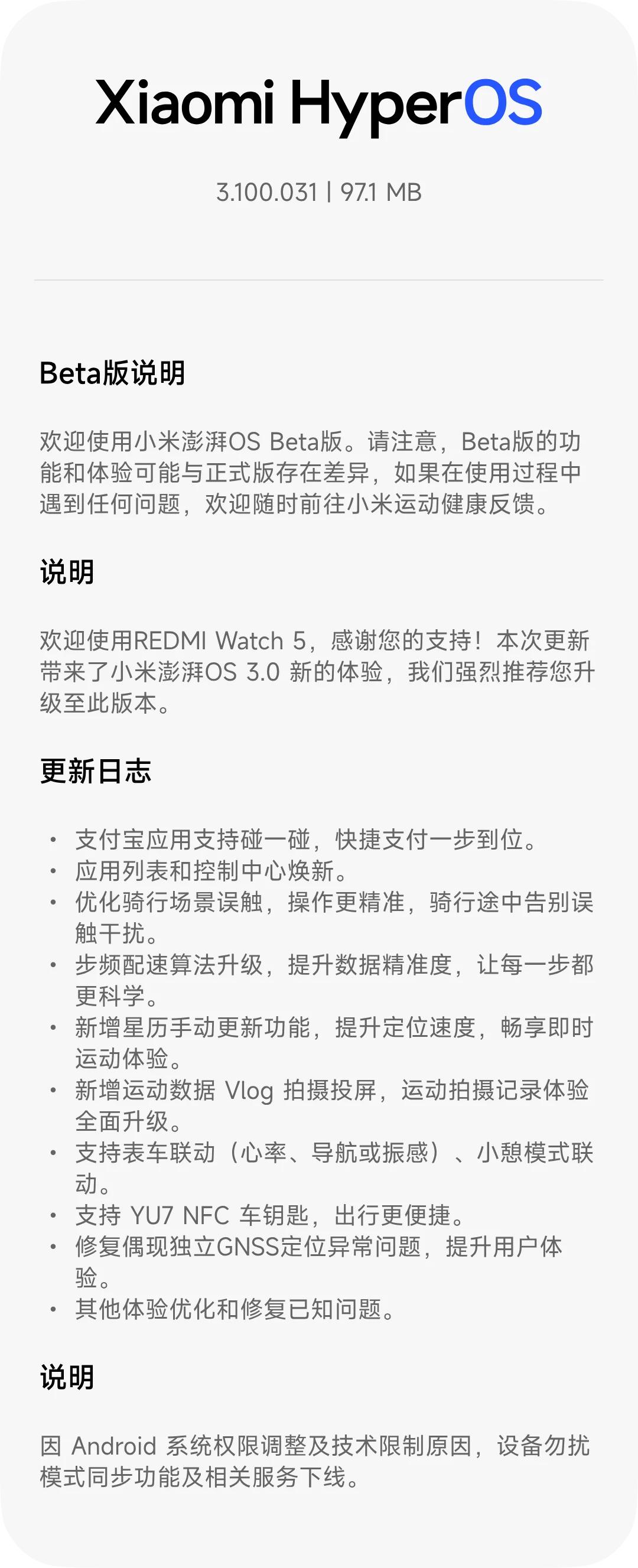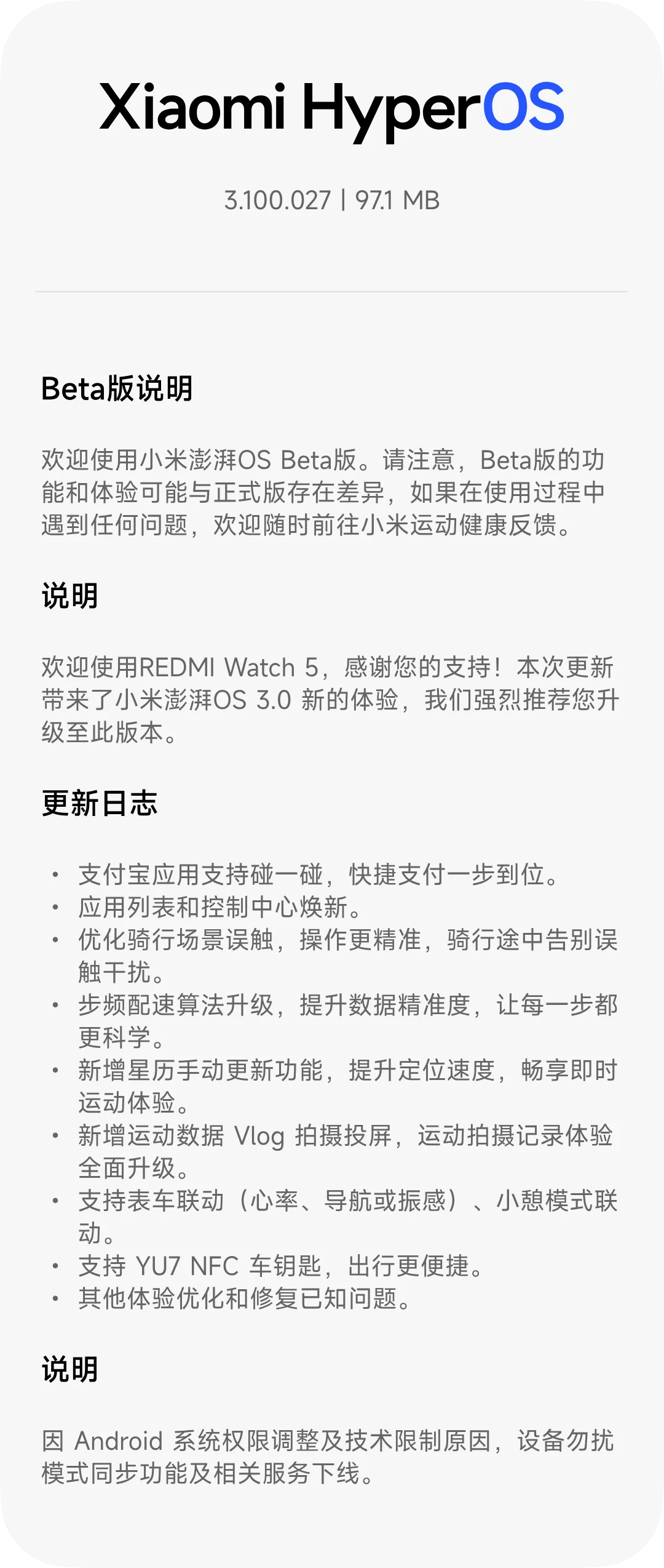 xinghengCN LV1919810 ⚡认证创作者 🔥创作者 🎖️荣誉成员 社区会员 米坛社区六周年纪念勋章 米坛社区百万注册纪念勋章 米坛社区五周年纪念勋章 米坛社区四周年纪念勋章 昨天 15:16 #12 xinghengCN 升级了 REDMI Watch 5 蓝牙版【国行】 HyperOS 2/3 官方固件 的新版本: 【HyperOS3】3.100.031[Beta] 浏览附件57989浏览附件57991 点击展开... 阅读此次升级的详细信息...