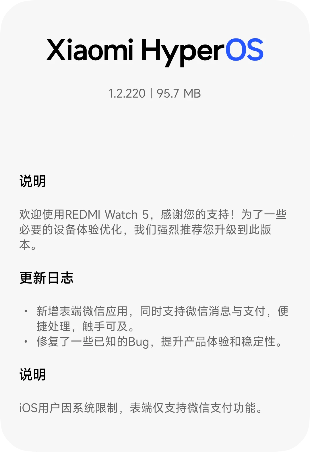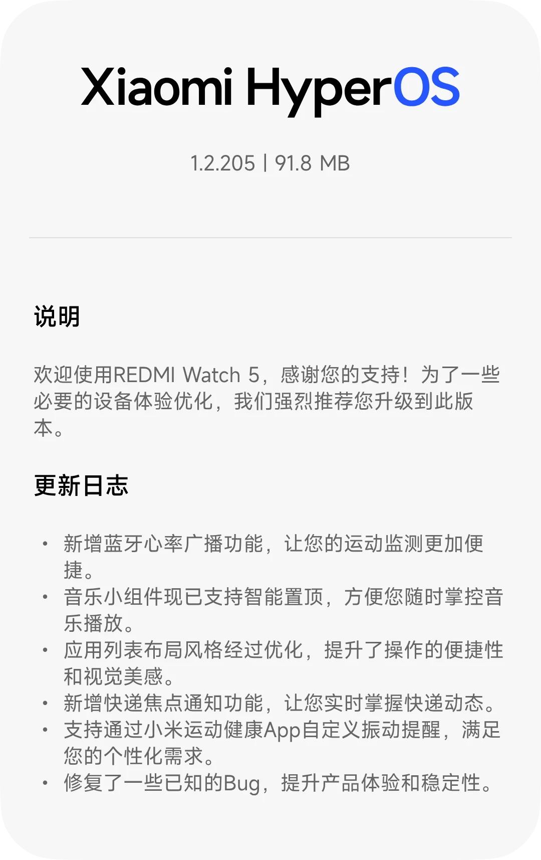 xinghengCN 升级了 REDMI Watch 5 蓝牙版【国行】 HyperOS 2/3 官方固件 的新版本: 1.2.220 浏览附件57979浏览附件57980 点击展开... 阅读此次升级的详细信息...