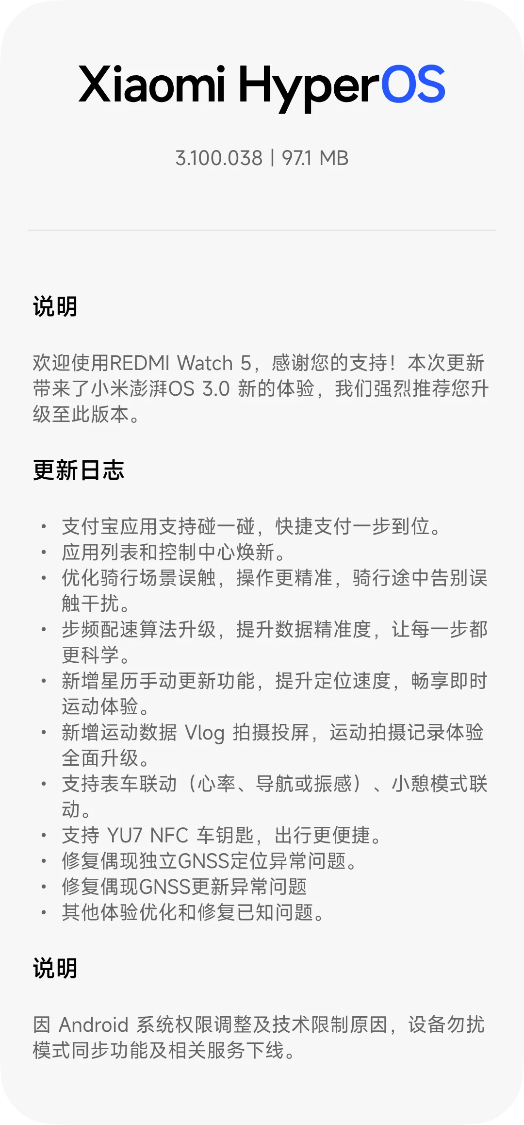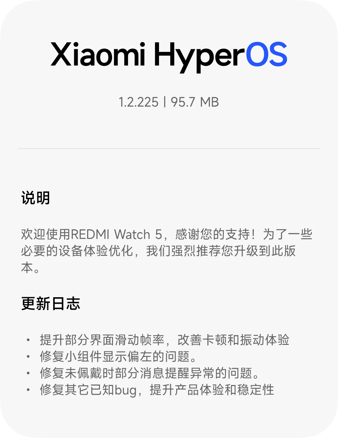 xinghengCN LV1919810 ⚡认证创作者 🔥创作者 🎖️荣誉成员 社区会员 米坛社区六周年纪念勋章 米坛社区百万注册纪念勋章 米坛社区五周年纪念勋章 米坛社区四周年纪念勋章 昨天 15:20 #13 xinghengCN 升级了 REDMI Watch 5 蓝牙版【国行】 HyperOS 2/3 官方固件 的新版本: 3.100.038 浏览附件57993浏览附件57994 点击展开... 阅读此次升级的详细信息...