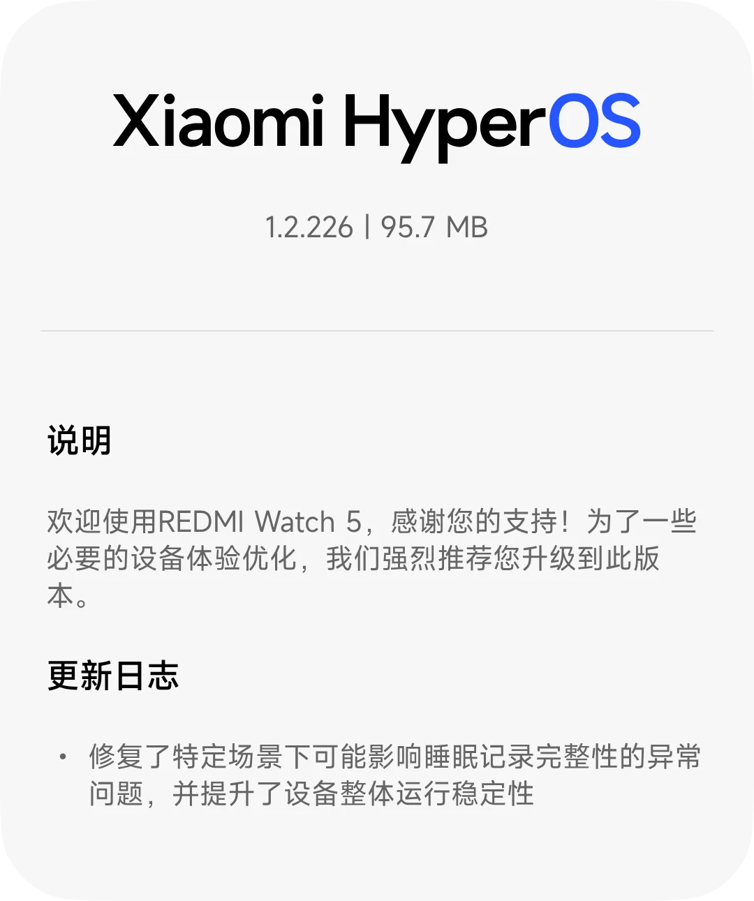 xinghengCN 升级了 REDMI Watch 5 蓝牙版【国行】 HyperOS 2/3 官方固件 的新版本: 1.2.226 浏览附件57983 浏览附件57984 点击展开... 阅读此次升级的详细信息...