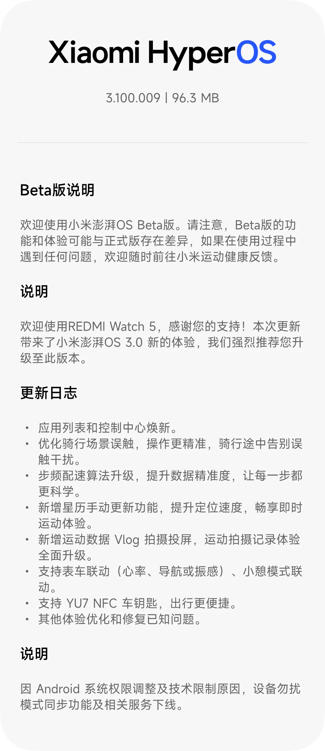 xinghengCN 升级了 REDMI Watch 5 蓝牙版【国行】 HyperOS 2/3 官方固件 的新版本: 3.100.038 浏览附件57993浏览附件57994 点击展开... 阅读此次升级的详细信息...
