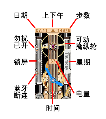 1、可显示:日期、星期、时间、上下午、步数、电量、勿扰、锁屏、蓝牙。